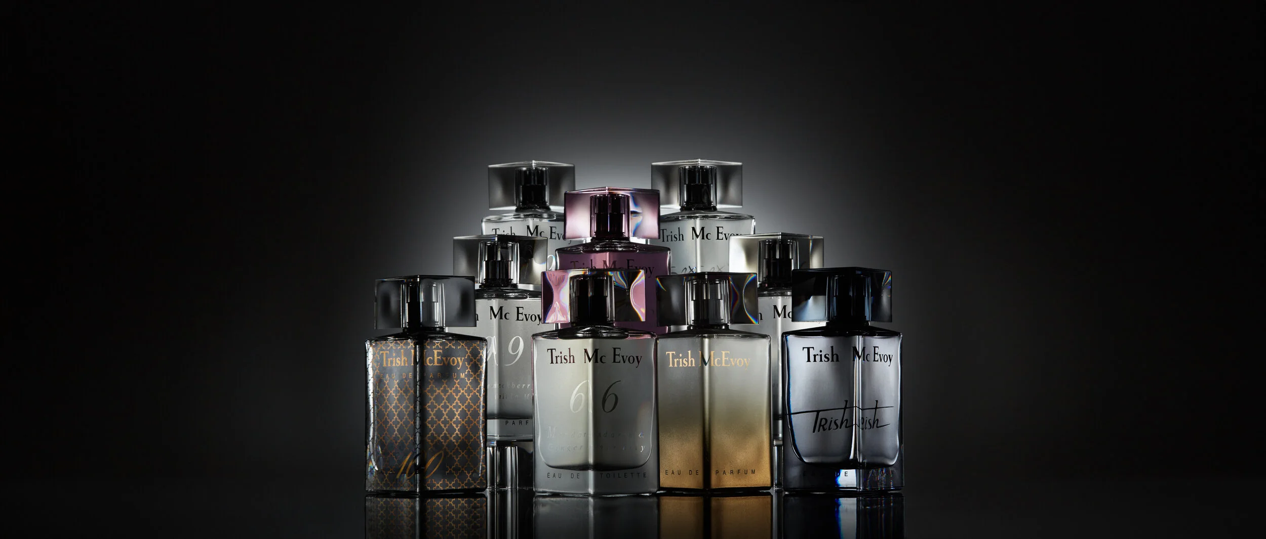 A collection of perfume bottles with black caps, arranged in a pyramid on a reflective surface against a dark background. View fullsize